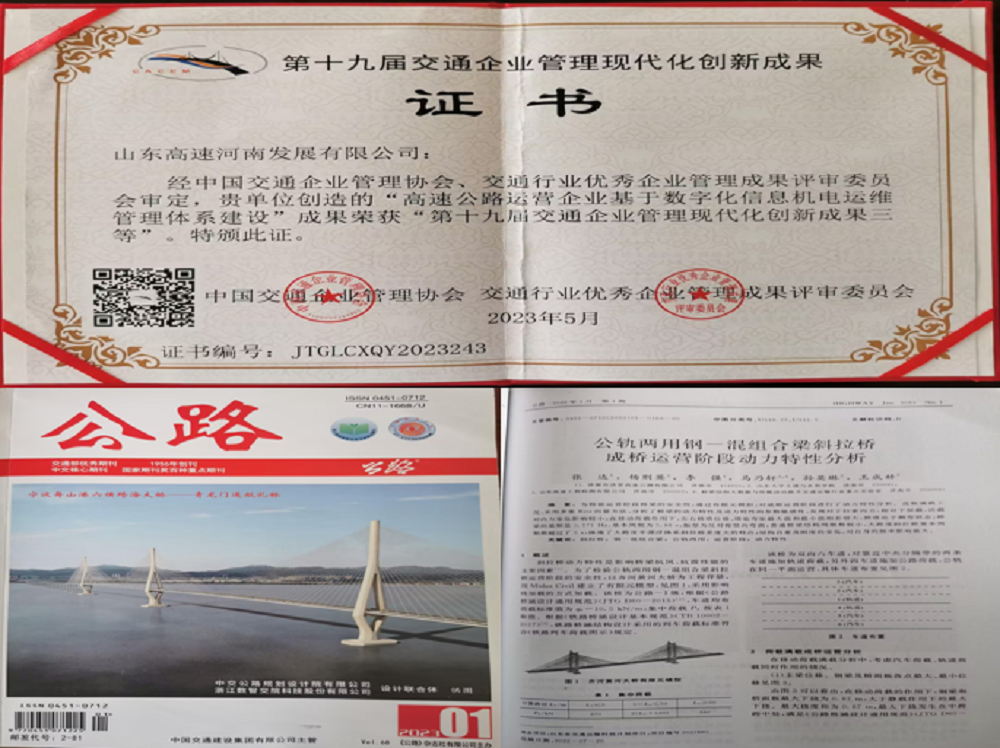 道阻且长,行则将至。在推进桥隧智慧管养系统建设的过程中,通过不断总结提炼形成的管理创新成果《高速公路运营企业数字化信息机电运维管理体系建设》荣获国家交通行业三等奖;科技创新课题《高墩大跨桥梁下挠预警对策研究》荣获发明专利1项、软件著作权1项、核心论文7篇。