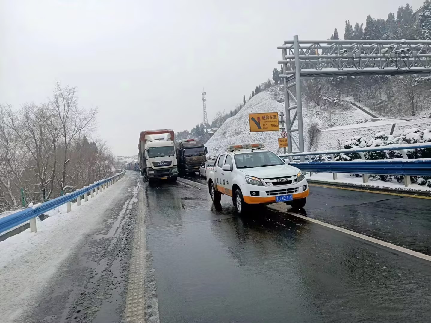 强化研判,科学部署。强化应急联动处置机制,密切关注气象信息,科学预警研判;联合高速交警交通执法局、消防救援站及外协清障单位雪前召开保通联席会议,明确各方职责,根据辖区路段情况统筹安排和科学调配保通人员、除雪设备、融雪物资,路产管理大队、养护所、高速交警大队实施联合巡查,全方位做好道路保通、除雪融冰工作,最大限度减少封闭时间。