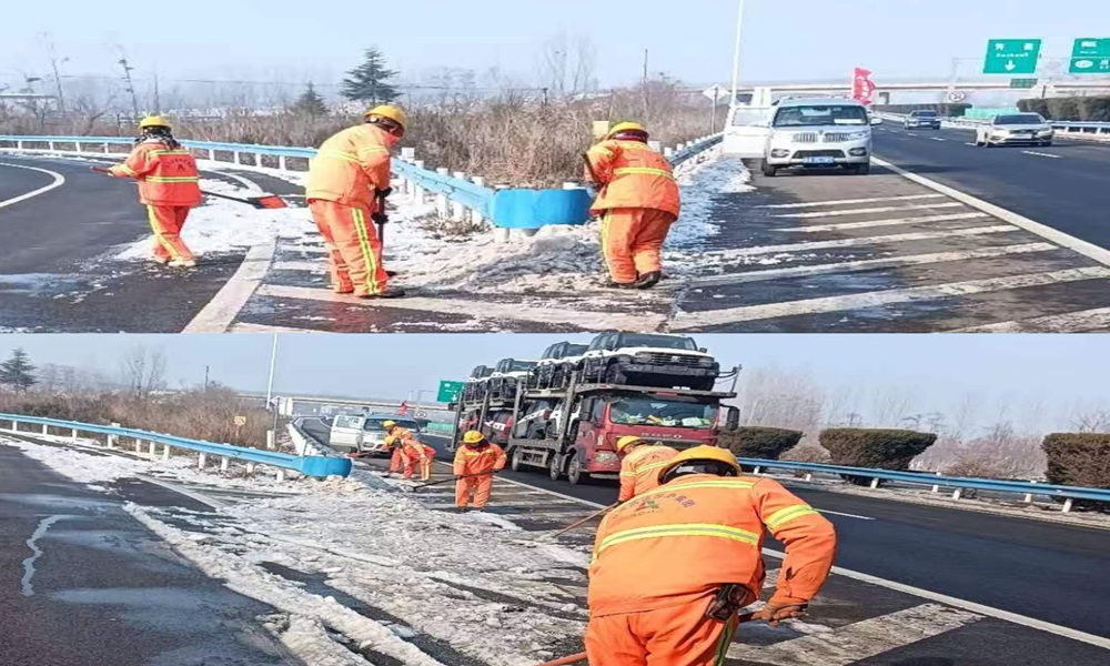 持续残留积雪清理。对匝道加宽段、护栏底部、隔音墙背面、天桥下方等重点部位进行巡查,采取“人工+机械”的方式对死角残雪残冰进行彻底清除,累计投入人工30余工日、机械12台班,有效防止因夜间气温降低导致结冰现象。