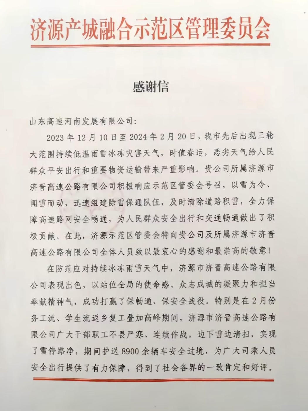 近日,河南发展公司济晋高速收到一封感谢信。信中,济源市产城融合示范区管理委员会对2023年冬季至2024年初春期间,河南发展公司在济源地区大范围低温雨雪冰冻灾害天气中出色工作表示衷心的感谢。