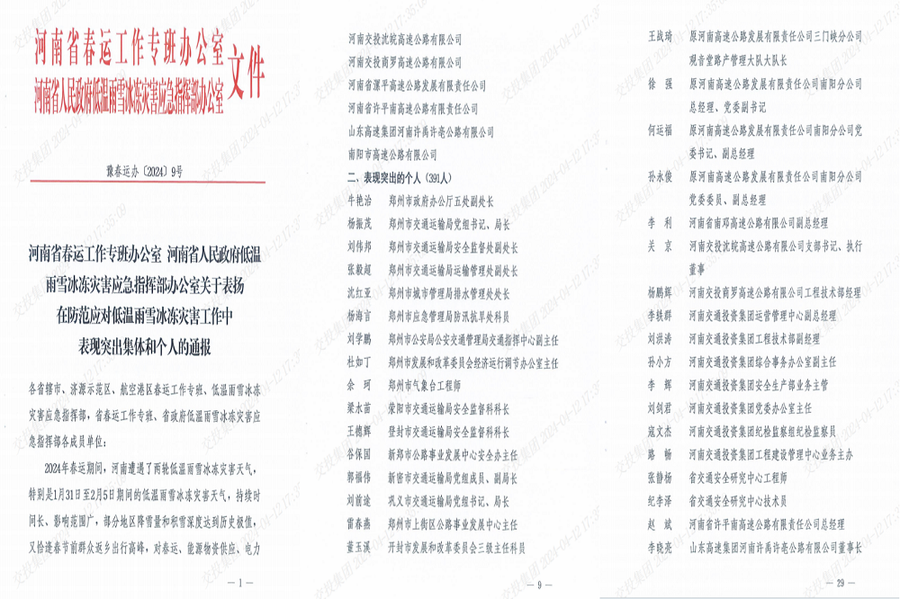 近日,河南发展公司在河南省春运工作专班办公室与河南省人民政府低温雨雪冰冻灾害应急指挥部办公室联合组织的表彰活动中,获“防范应对低温雨雪冰冻灾害工作中表现突出集体和个人”殊荣。