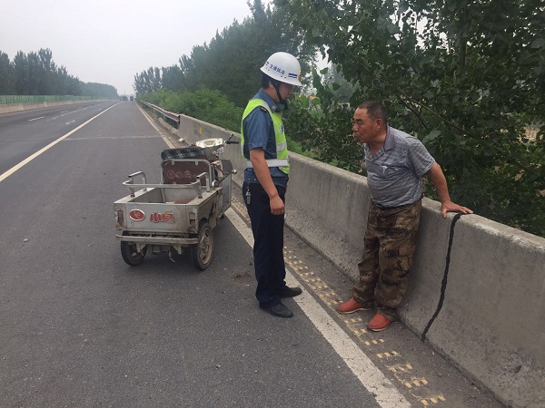 2018年7月11日16时40分,路政人员巡查至K256+100M下行处时,发现一老人在超车道上逆行骑着一辆电动三轮车,全然不顾身边呼啸而过的车流,此时情况十分危急,路政人员立刻停车上前制止,将骑车老人引导至安全区域,经过耐心询问得知,老人因中午喝了酒,找不到回家的路,迷迷糊糊上了高速,经过路政人员的仔细观察,发现他有通信工具,通过通信工具与其家人联系,让其家人在许昌西收费站院内等候,路政人员一人驾车将老人带回收费站,一人将电动车骑至收费站,因考虑到天气炎热老人口渴,路政人员给老人买了瓶水,让老人耐心等待家人。 家人看到老人平安无事,对此表示十分感激,用物质表示感谢,被路政人员婉言谢绝,此时家人焦急的表情逐渐恢复了平静,看到他们一家人安全团聚,路政人员悬着的心也踏实了,并对其家人进行安全教育宣传,增加他们的安全意识。