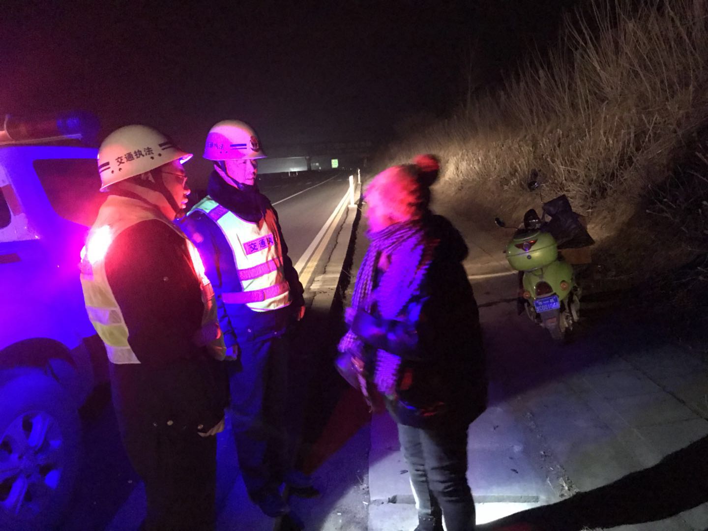 2018年12月16日22时30分,路政大队接收费站报警一人骑电车闯岗上高速往禹州方向驶去,路政大班长江双建考虑到天色已晚,立即带领队员迅速行动,通过在高速上仔细寻找,发现了该骑车人正在行车道上,疾驰车辆纷纷避让,情况十分危险。路政人员一边对过往车辆鸣笛示警,一边将骑车女子迅速引导在应急车道。通过询问得知,该女子因家庭矛盾心情不愉快,喝了一些酒,找不到回家的路,迷迷糊糊上了高速,该女子无法提供家人的联系方式,路政人员将该女子及其电车送到高速最近收费站,通过与地方派出所联系,联系到其家人,家人正到处寻找该女子,家人看到该女子后,脸上露出笑容,看到一家团聚,大家悬着的心一下平静了下来。女子家人握着路政人员的手并以钱物表示十分感谢,被我们婉言谢绝并表示这是我们应该做的。