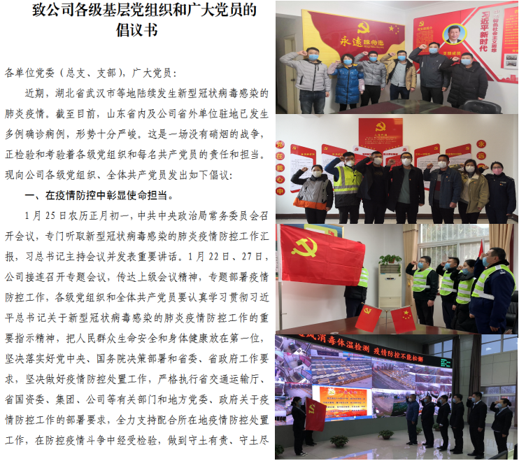 (三)积极协同,主动担当,与地方政府联防联控,筑牢防控工作安全防线。一是自疫情发生后,公司党委所辖各党支部主动与地方交警、卫生防疫等部门沟通联系,协助相关人员在各收费站出入口做好防疫检测工作,并为他们提供必要物资保障,多方联控、多措并举、各司其职,共同筑牢疫情蔓延城市的第一道防线。二是严格落实上级保畅通工作相关要求,坚持“一断三不断”,落实好应急物资及医患人员运输车辆跨省通行高速公路免收通行费政策,开辟“绿色通道”优先通行,保障疫情防控物资、人员应急运输高效顺畅,统筹做好疫情防控工作和交通运输保障工作。